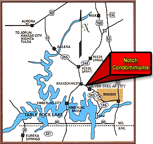 Take Hwy 65 about 7 miles into Missouri to Hwy 265 (5 miles South of Branson). Follow 265 over Tablerock Dam, North past the "Chateau on the Lake". (Hwy 265 & 165 run together over the dam; then 265 branches to the left near the Chateau). Continue on 265 to the Hwy 76 stoplight. Turn left and travel West about one mile past Silver Dollar City to Notch Inn and Condominiums on right side.